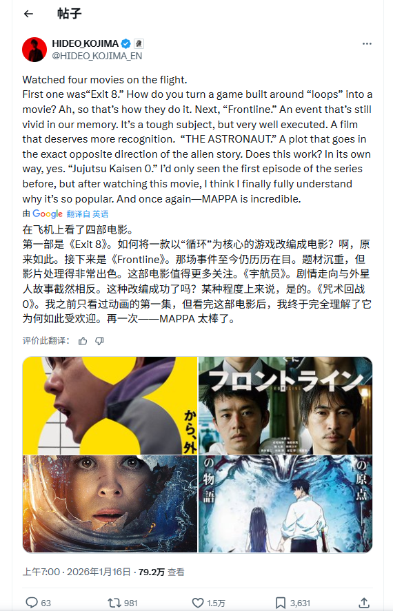 日本知名游戏制作人小岛秀夫近日在社交媒体分享飞行观影心得,直言看完《咒术回战0剧场版》后“终于理解这部作品为何全球爆红”,并盛赞动画制作公司MAPPA“实力超群”。此番言论引发网友热议,恰逢《咒术回战》第三季“死灭回游 前篇”于1月9日开播,该动画迅速跻身本季新番热门榜单。