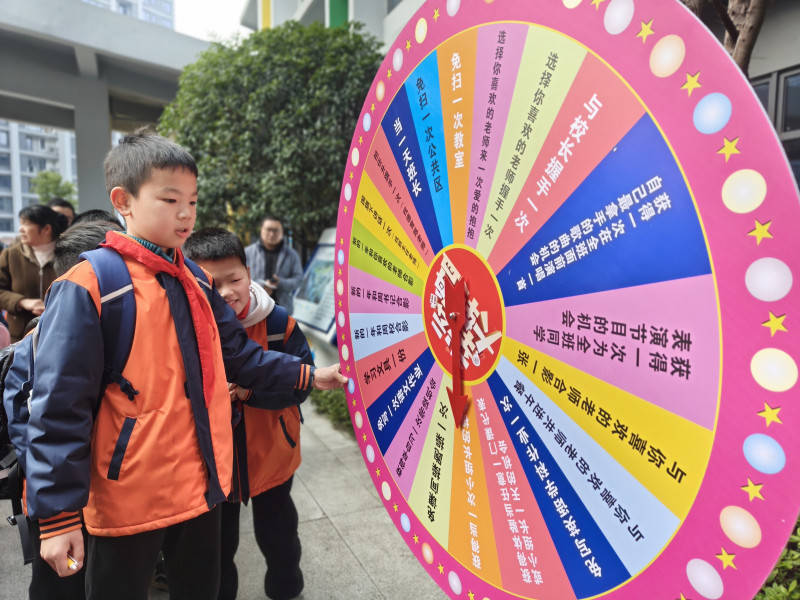 “新年转转乐”区域传来了阵阵欢笑。同学们转动五彩大转盘,指针停留在哪个地方,就可以获得“与校长共进午餐”“担任一日班长”“获得创意文具包”等惊喜。这种充满仪式感的互动,带来了开学首日的快乐,也在无形中向孩子们传递了一个清晰的信息——你们的选择被尊重,你们的体验被珍视。