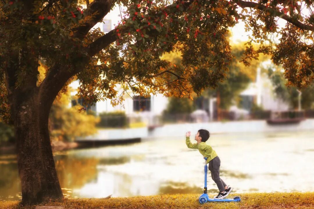 对孩子来说,清新的空气、洒落的阳光、闪着波光的池塘、四季变换着的绿植和行走的陌生人,捉虫看鸟、见证花草荣枯、登高望远,都是最天然的快乐。