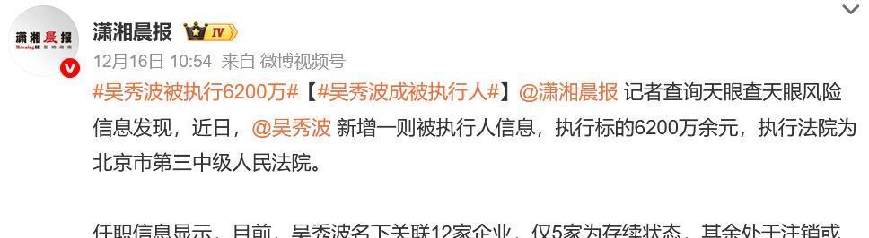 近日,有媒体爆料吴秀波又新增一条被执行人信息,被执行金额为6200万元。