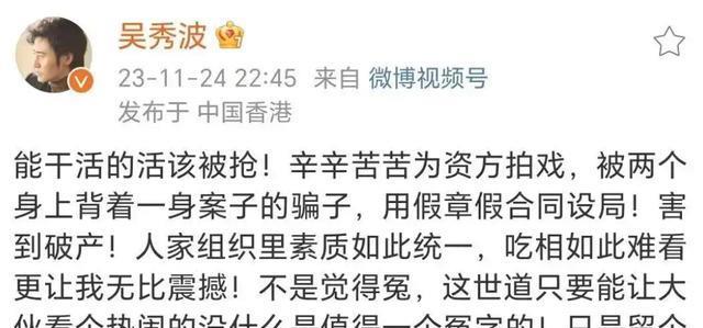 吴秀波多年来一直主张自己被骗,几次发博鸣冤,称自己辛辛苦苦为资方拍戏,被两个身上背着一身案子的骗子用假章假合同设局,害到自己破产。吃相如此难看,让他无比震撼。