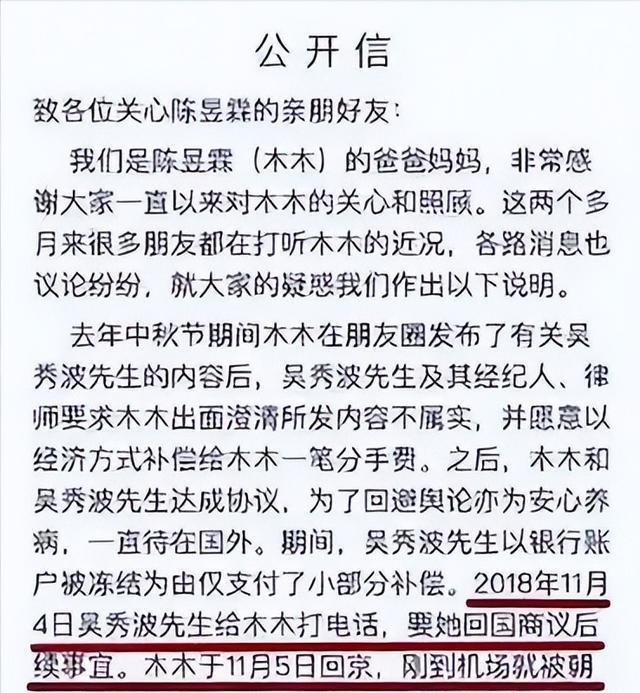 2018年9月,女演员陈昱霖发文曝光自己与吴秀波长达七年的地下情,并控诉他与多名女性有不正当关系。